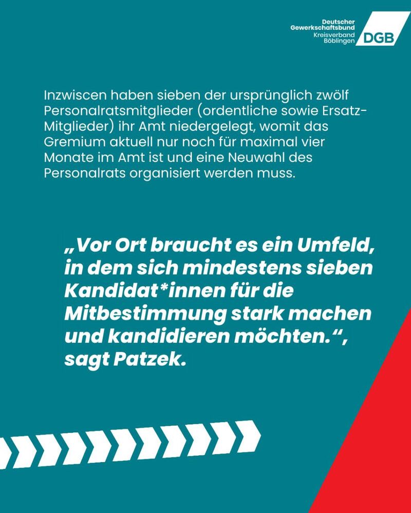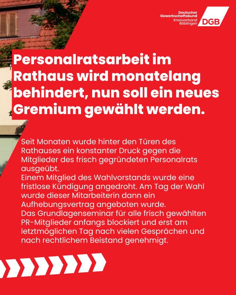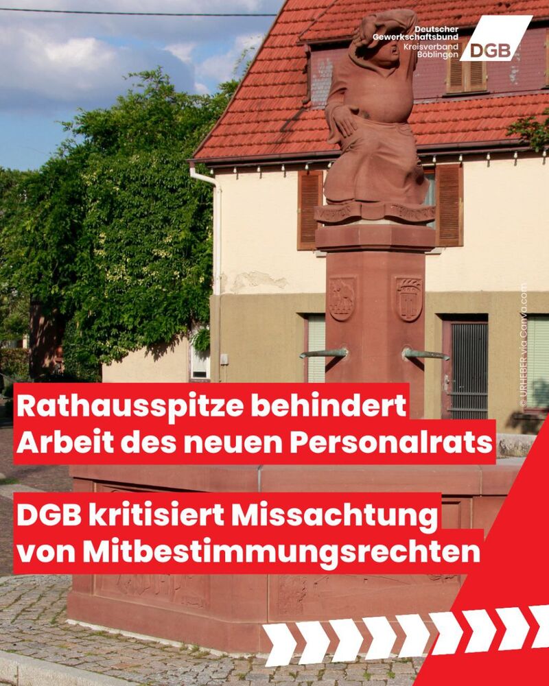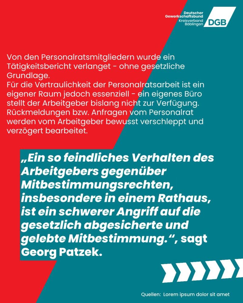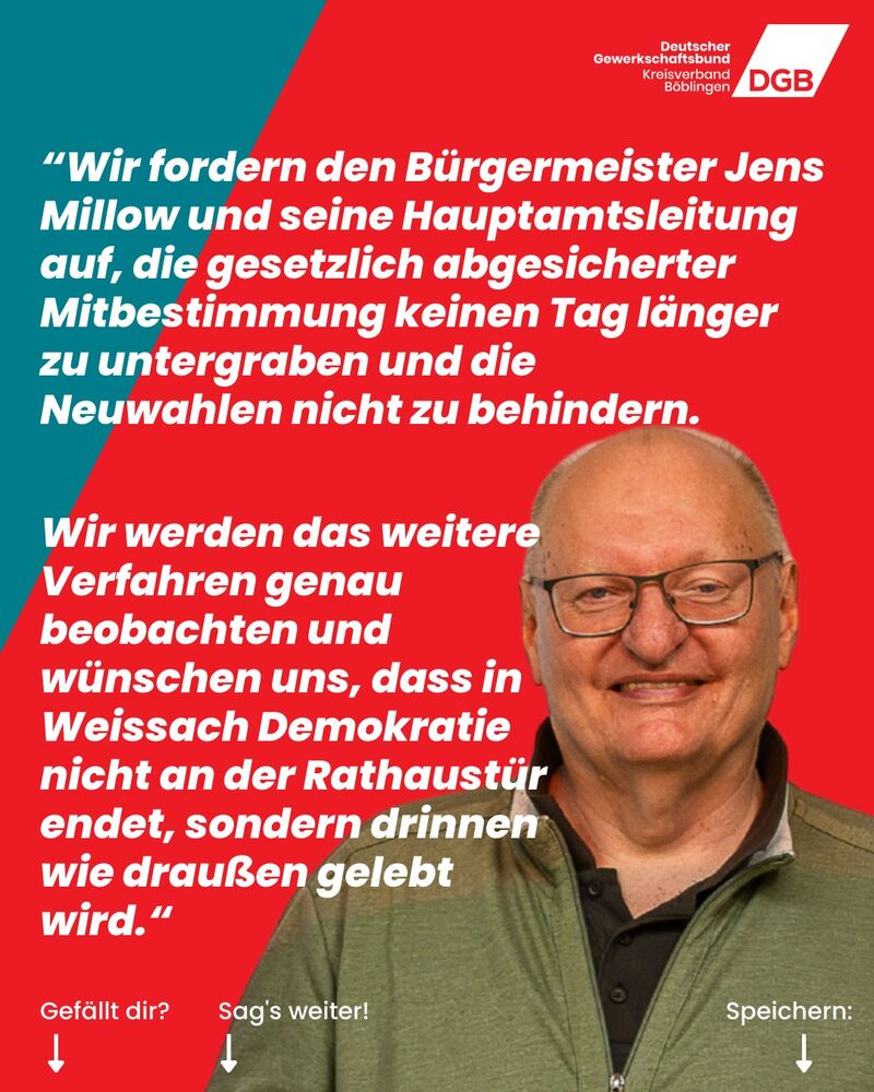 „Ein so feindliches Verhalten des Arbeitgebers gegenüber Mitbestimmungsrechten, insbesondere in einem Rathaus, ist ein schwerer Angriff auf die gesetzlich abgesicherte und gelebte Mitbestimmung“, sagt Georg Patzek, DGB-Kreisvorsitzender Böblingen.