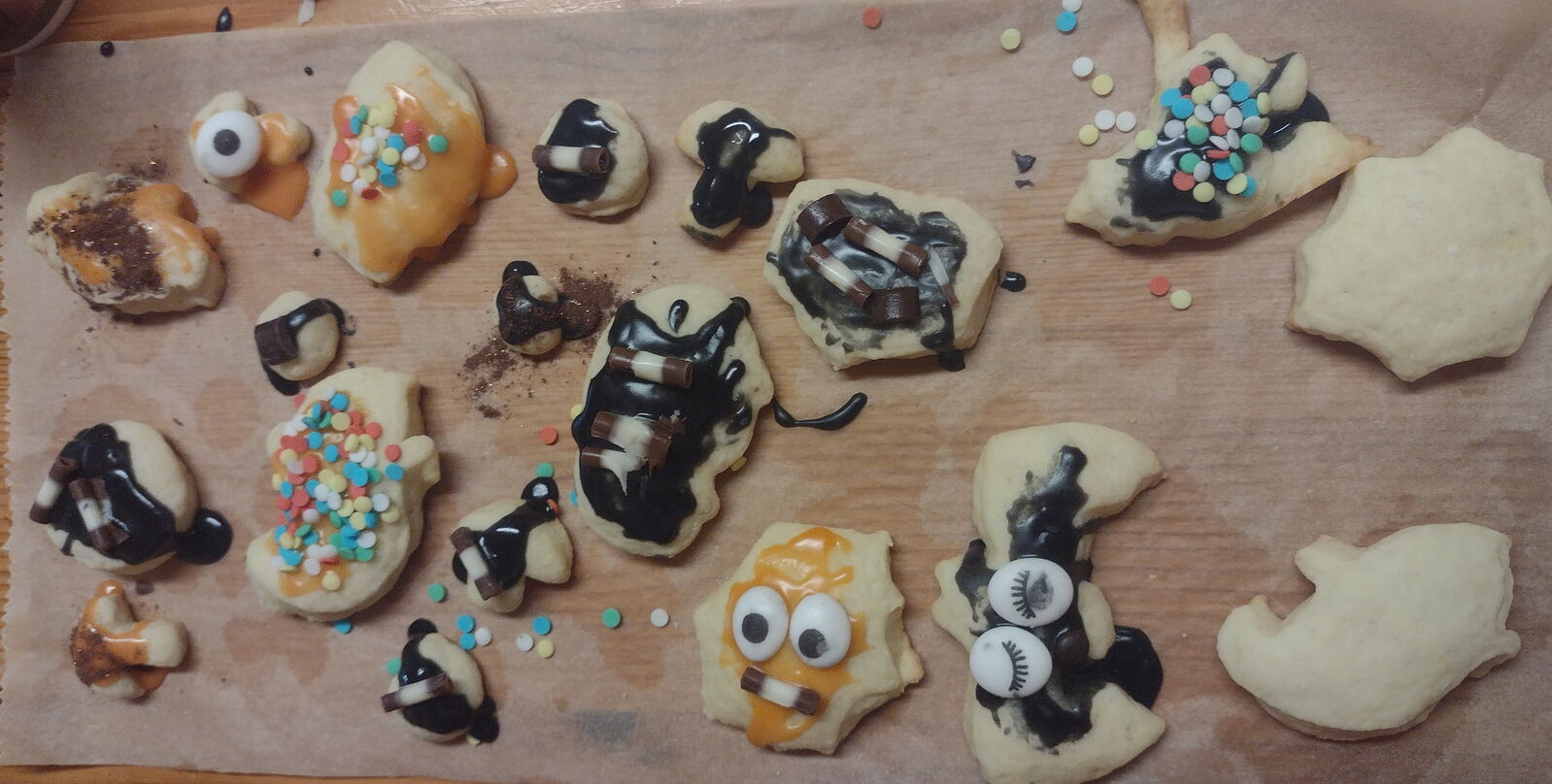 Die zehn Minuten waren bald vorbei und es war Zeit, der Fantasie freien Lauf zu lassen. Es gab schwarzen und orangenen Zuckerguss, Wackelaugen, Schokoladentropfen, Goldpuder und bunten Zucker. Die Gespräche an den Tischen waren lustig und angeregt, während immer verrücktere Kekse unter den Fingern der Kinder entstanden.